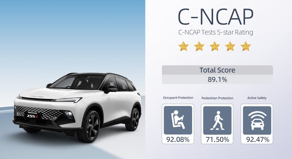 The latest C-NCAP test results reveal that Beijing X55II achieved an impressive overall score of 89.1%, surpassing the average score of tested models at 79.5%, earning it a Five-Star Safety Rating.