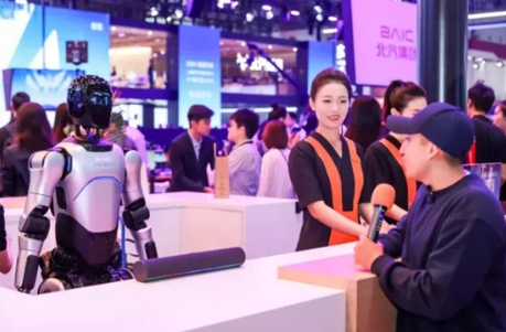 来到北汽集团展台,你会惊讶发现,以往前台接待的“小姐姐”不见了,取而代之的是一位略显生疏,但未来感十足的机器人接待生,这正是智元机器人,已经承担起和观众互动的重任。具身机器人还只是一个小小的“开胃菜”,在北汽集团展台转转,还有更多惊喜:展台一角的滑板电动平台互动体验区,正在上演“原地转圈”和“横行”的神奇表演;一辆有着L4级智驾水平的Robotaxi车型为观众展示未来出行的雏形;也有不少观众还在戴着Rokid AR眼镜看展,或者在智能座舱体验区,感受沉浸式的智能拟人交互对话……如此种种,高“含智量”正是北汽集团展台给人的第一印象。