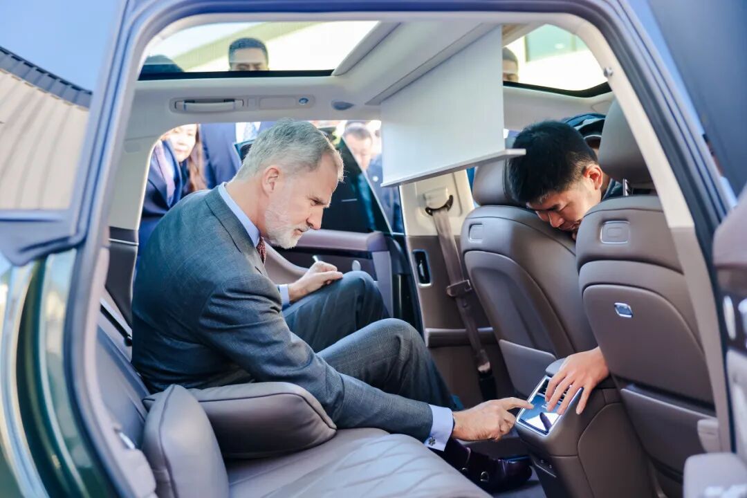 张建勇向费利佩六世重点介绍了享界 S9T的智驾系统、自动泊车功能和零重力座椅等。得知享界 S9T配备智能投影巨幕系统2.0,费利佩六世特意坐到后排进行体验。