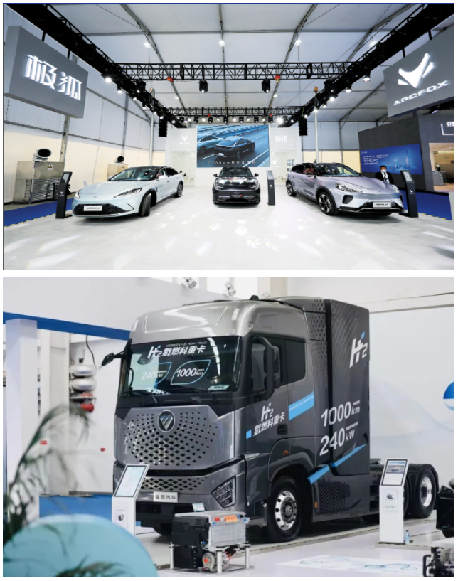 极狐汽车阿尔法T、阿尔法S、阿尔法S 全新HI版,福田70Mpa氢燃料客车(冬奥版)在大会重磅亮相,北汽集团旗下的绿色科技产品跨越乘商两栖。