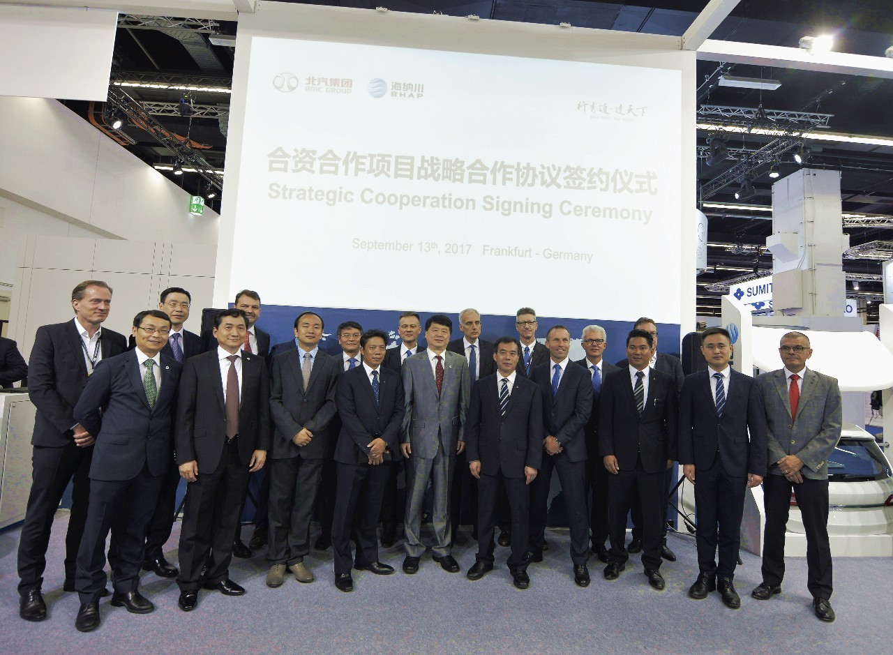 2017年9月13日,北汽集团携旗下北京海纳川汽车部件股份有限公司亮相第67届法兰克福车展,展示了北汽集团自主研发的“智能化、电动化、轻量化”汽车零部件产品。这是北汽集团在国际重量级舞台上对自身产业链综合能力和前瞻科技的一次重要展示,是“集团化2.0”战略在海外的重要实践。